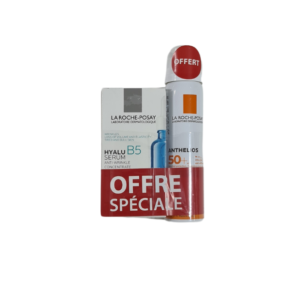 Sérum anti rides hydratant repulpant, alliant deux types d'acides hyaluronique purs,vitamine B5 et madécassoside + ANTHELIOS BRUME FRAÎCHE INVISIBLE SPF50 offre une très haute protection à large spectre (UVA, UVB) et aide à protéger la peau des dommages cutanés causés par les rayons infrarouges et la pollution.