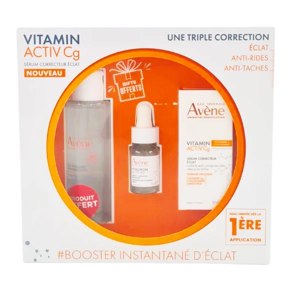 Pack soin anti-âge et éclat comprenant le Sérum Avène Vitamin Cg (30ml), l'Eau Micellaire (100ml) et un Sérum activ B3 (10ml) offerts. Ce trio lutte contre les rides, repulpe la peau et ravive l'éclat, tout en nettoyant et hydratant votre peau en profondeu