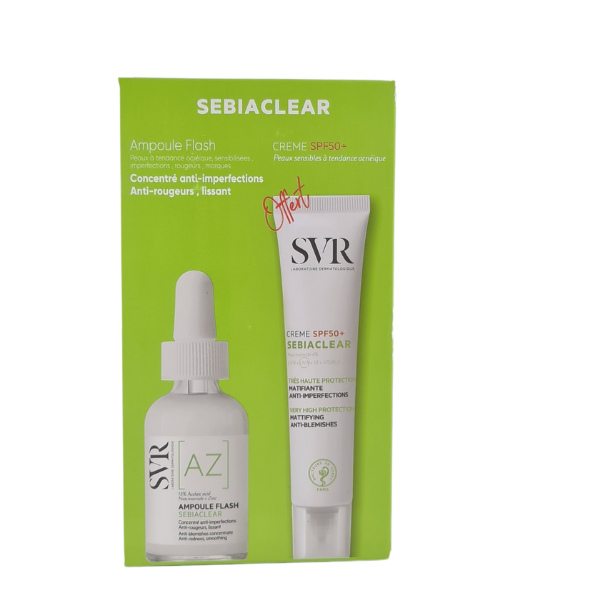 SEBIACLEAR Ampoule Flash 30ml c’est le nouveau soin qui agit sur tous les paramètres à l’origine des peaux à tendance acnéique pour corriger les imperfections en un temps record + Sebiaclear Crème SPF50+ protège et corrige les peaux grasses à imperfections. Matifiante, elle prévient l’effet rebond lié à l’exposition UV pour éviter imperfections et marques.