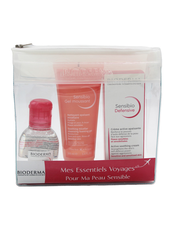 La Trousse Voyage BIODERMA Sensibio est un ensemble complet pour les peaux sensibles en déplacement. Elle comprend l'Eau Micellaire pour démaquiller, le Gel Moussant pour nettoyer et la Crème Défensive pour hydrater et protéger.Veuillez vérifier ces informations sur l'emballage du produit ou sur le site officiel de BIODERMA pour obtenir les données les plus précises et les plus récentes.