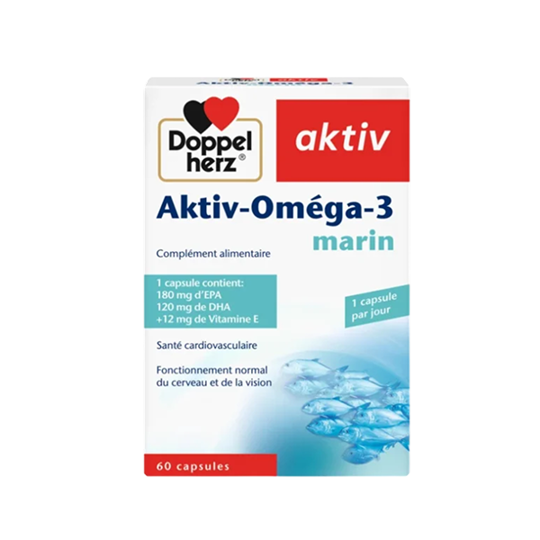 Une capsule de Doppelherz Aktiv-Oméga-3 fournit 180 mg d’EPA et 120 mg de DHA. Ces acides gras oméga-3 contribuent à la fonction cardiaque normale.