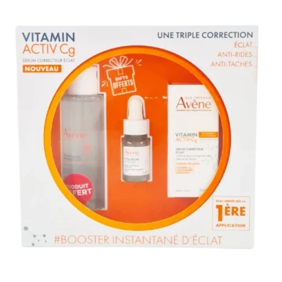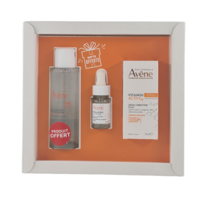 Pack soin anti-âge et éclat comprenant le Sérum Avène Vitamin Cg  (30ml), l’Eau Micellaire  (100ml) et un Sérum activ B3 (10ml) offerts. Ce trio lutte contre les rides, repulpe la peau et ravive l’éclat, tout en nettoyant et hydratant votre peau en profondeu