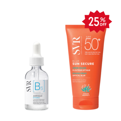 Le pack SVR Ampoule Hydra B3 & Sun Secure Blur SPF50+ combine hydratation intense, apaisement et haute protection solaire. L’ampoule enrichie en vitamine B3 et acides hyaluroniques hydrate, repulpe et réduit les inconforts. Le Sun Secure Blur SPF50+ protège des UV tout en floutant les imperfections pour un teint unifié et lissé. Un duo parfait pour une peau nourrie, protégée et visiblement plus jeune.