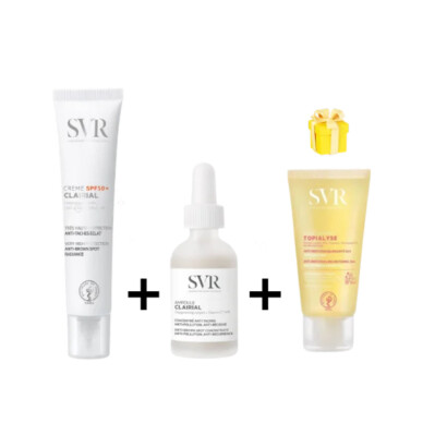 SVR Clairial Ampoule Anti-Tache 30ml | Concentré triple action corrige tous les types de taches brunes en 14 jours*. Il prévient également l’apparition de nouvelles taches et offre un effet anti-taches durable un mois après l’arrêt du soin + CLAIRIAL SPF50+ 40ml Soin anti-taches 2-en-1 qui corrige et prévient l’apparition des taches brunes. Réduit la taille des taches et améliore l’uniformité du teint dès 28 jours.
